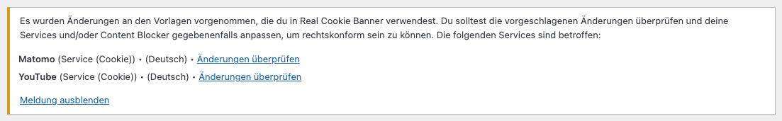 Real Cookie Banner verfügt über eine ausgelagerte Service-Datenbank, mit der sich auch ohne Updates des Plugins selbst in regelmäßigen Abständen die Service-Vorlagen aktualisieren lassen. Um rechtlich auf dem neuesten Stand zu bleiben, ist es wichtig, die Service-Vorlagen stets zu aktualisieren.